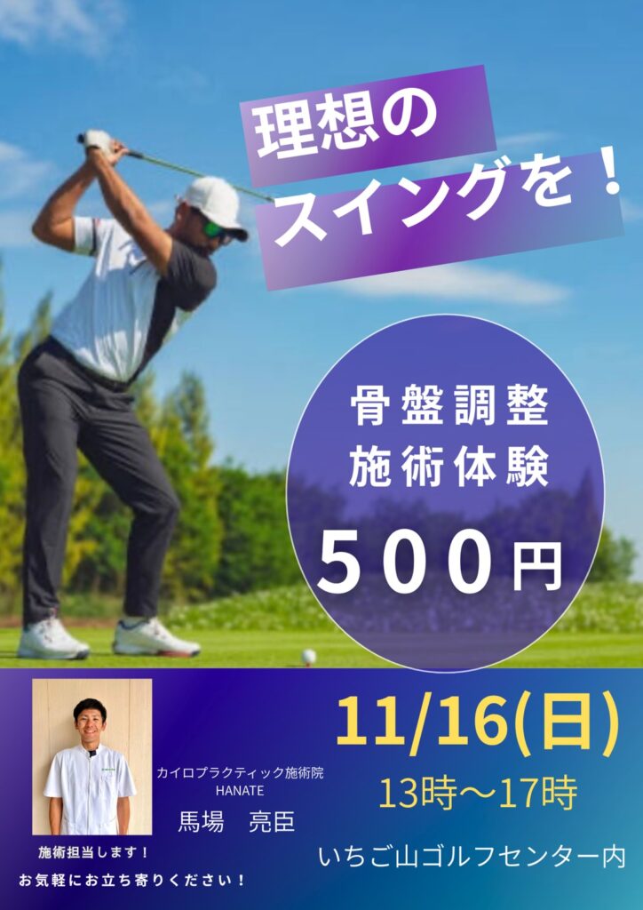 11月16日(日)13時~17時に当ゴルフセンター内にてカイロプラクティック施術院HANATEの馬場様による骨盤調整施術体験イベントを開催します!皆様、ぜひお越しいただき、理想のスイングを体感してください♪