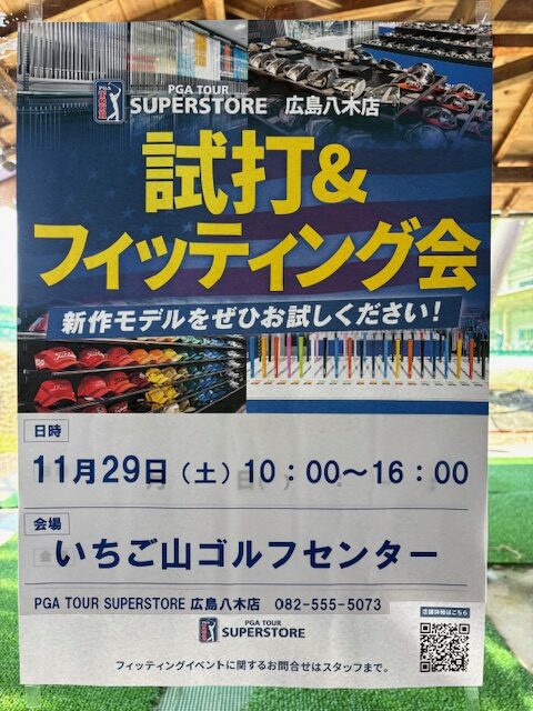 11月29日(土)10時~16時に当ゴルフセンター内にてPGA TOUR SUPERSTORE広島八木店様 にお越しいただき試打&フィッティング会を開催します!皆様、ぜひお試しいただきお気に入りのクラブを見つけてください♪ -